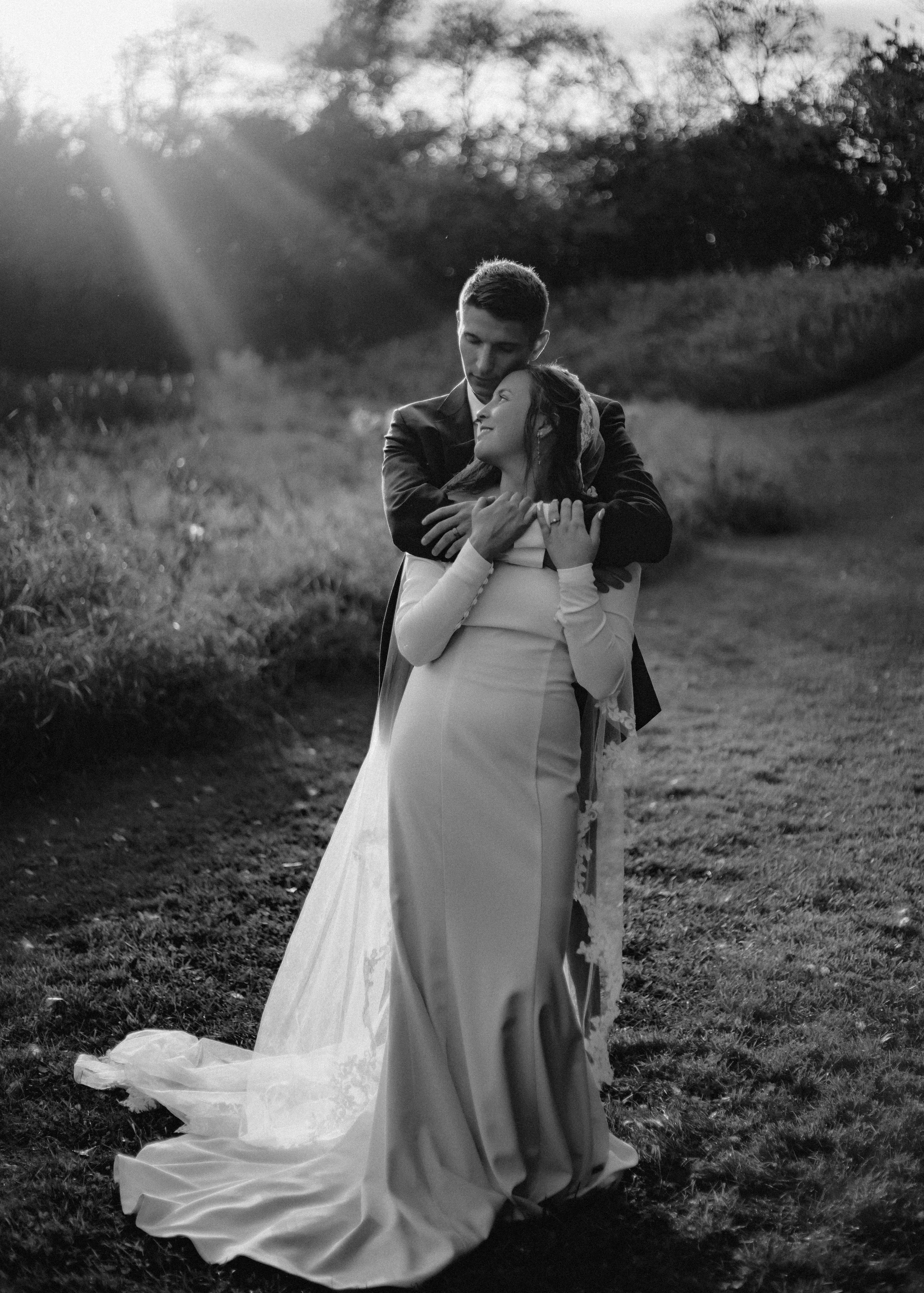 A black and white photo of a bride and groom embracing outdoors during sunset, with trees and grassy landscape in the background.